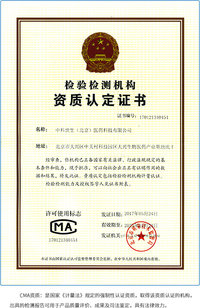 中科世生建有完善的與國際接軌的質量管控體系。2017年5月獲北京市質量技術監督局CMA認證授權、9月獲歐盟(EURM)實驗能力認可、12月獲中國合格評定國家認可委員會CNAS認證,這是目前國內在病毒檢測、滅活、去除工藝驗證領域獲得“三認證”授權的專業技術服務企業。2018年中科世生為用戶提交的英文版檢測報告已被美國FDA認可并取得注冊證書。